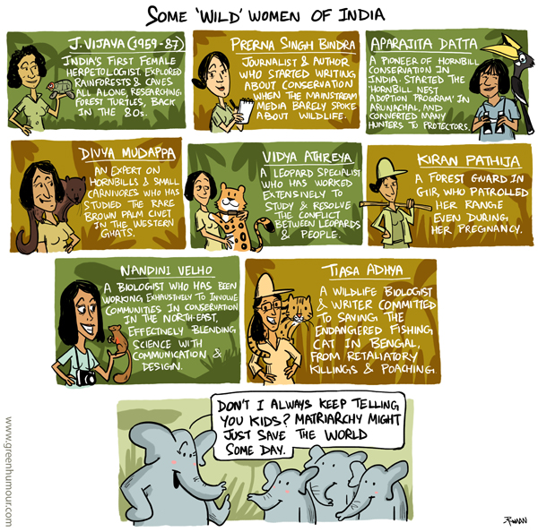 Rohan Chakravarty, creator of a popular comic column, writes: We know of Jane Goodall, Rachel Carson and Dian Fossey. But do you know about these heroes? This Women’s Day (8th March), Green Humour celebrates some ‘wild’ women of India- J.Vijaya, Prerna Bindra, Aparajita Datta, Divya Mudappa, Vidya Athreya, Kiran Pathija, Nandini Velho and Tiasa Adhya (click on names to view profiles). Many more that I wanted to name but could not (owing to space constraints in a comic strip) are Shaleen Attre, Neha Sinha, Krithi Karanth, Rita Banerji, Tasneem Khan, Rajashree Khalap, Ketki Jog and Cara Tejpal.