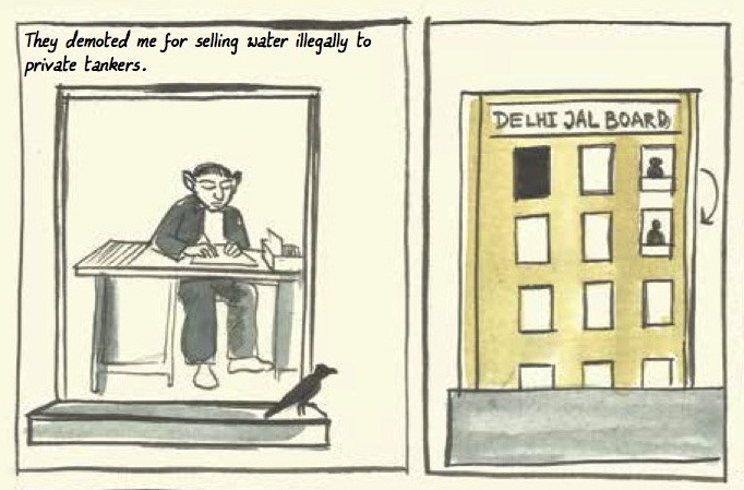 Sarnath’s stories have always been a mere vessel to showcase what he really wants to write and draw about-stereotypes . His earlier graphic novels were loosely strung vignettes of interesting characters and observations. The latest novel reads more like a book and is perhaps his best effort at keeping a consistent storyline running intact throughout the exposition. The sepia nostalgia of socialist India is still alive in these pages but more than that, this time there is a loud cry of dissent against the rise of capitalist culture in India, Delhi in particular-the exploitation of the bucolic paradise that was India at the hands of money grubbing corporates and privatisation. So it is no surprise that the protagonist is a naive plumber from a small town called Tambanagar, who comes to Delhi in search of a job and is sent on a mission instead. His native town turned into a hellhole by greedy miners in search of the copper that is Tambanagar’s main reserve. The water in Tambanagar turns to poison and Girish the plumber leaves for the city in search of better opportunities to ply his trade.