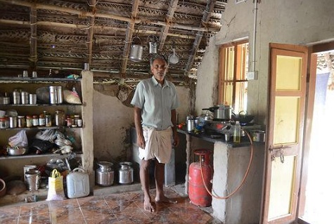 The doors of his small thatched-roof home are open on either end, allowing for healthy air circulation. A bamboo-jute ladder leads to the single bedroom, the red-oxide floor of which is piled with books. An Amma table fan is one of the only two things — a light bulb in the kitchen being the other — in this self-made house that runs on electricity. The bedroom stares into the hollow inside of a pyramid roof that he helped build with palmyra leaves and tin sheets.