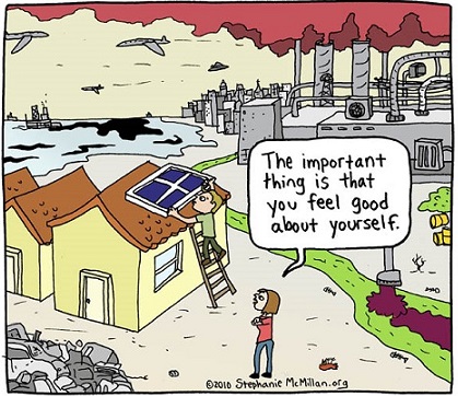 I now feel fishing is more appropriate than buying bottom-trawled fish fingers, frozen from a supermarket, or peanut butter in plastic tubs for that matter. While washing dishes and clothes with my hands seems more inconvenient than using machines, I suspect it could be considered more convenient than working out how to humanely deal with 200 million climate refugees in 30 years’ time.